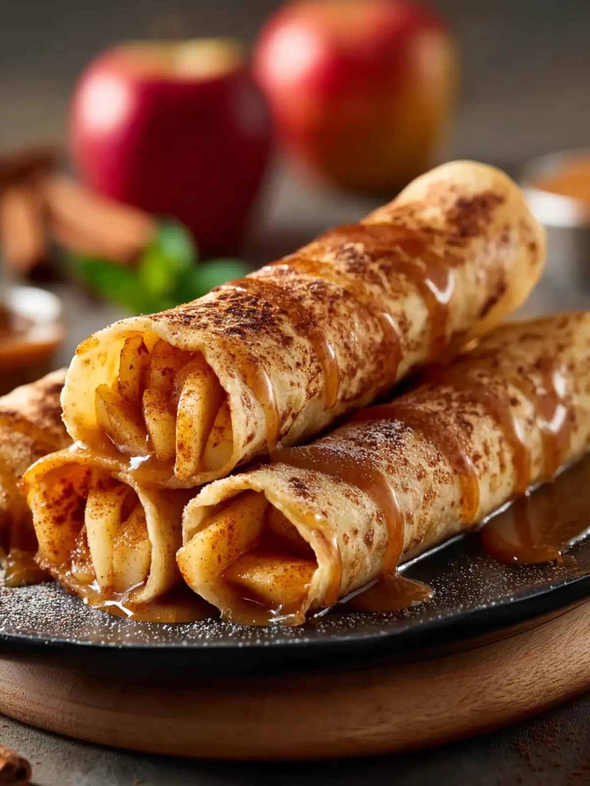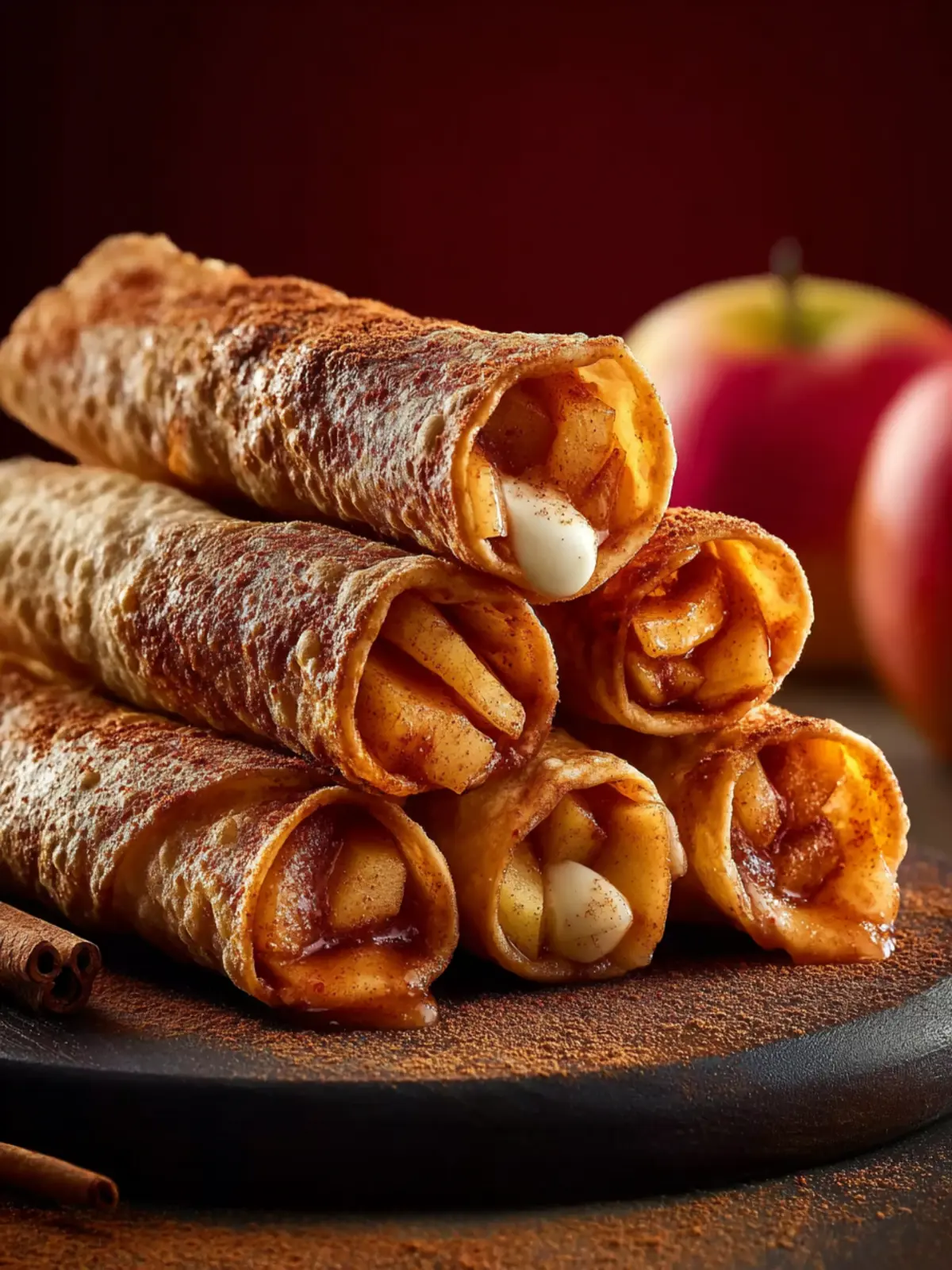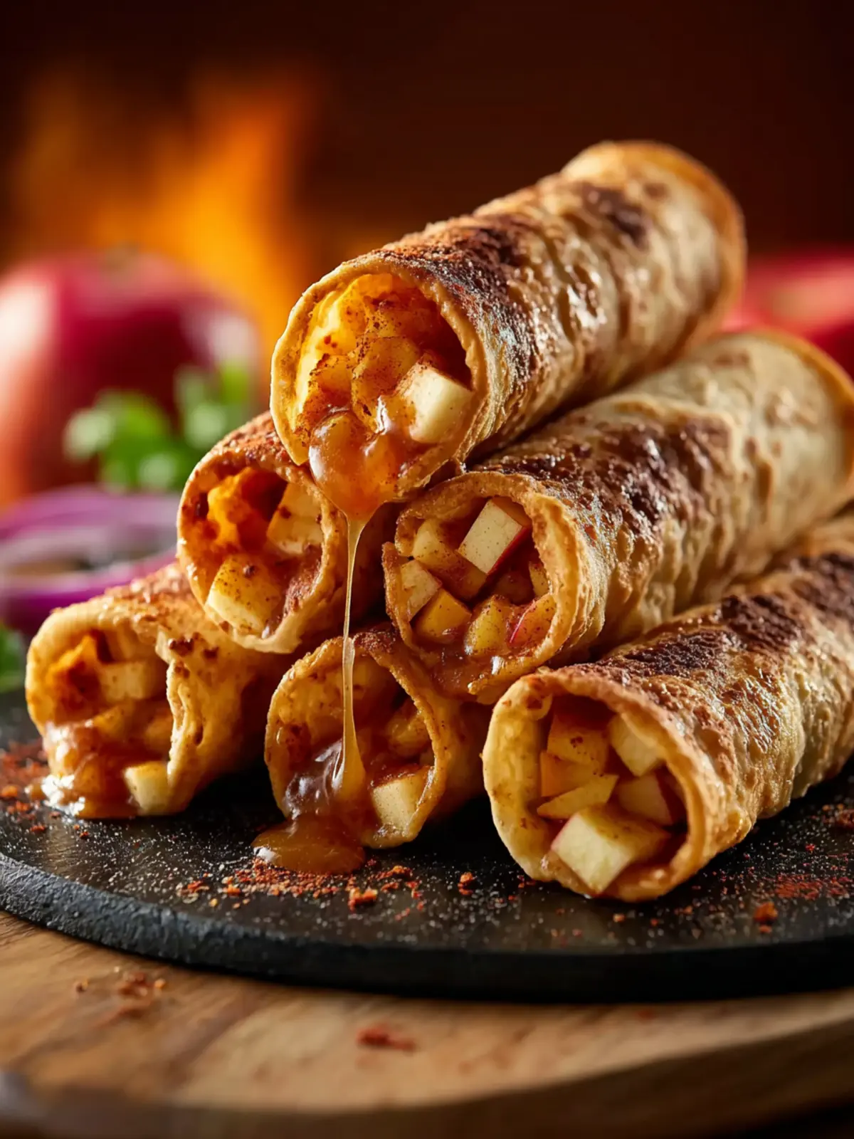 Crispy taquitos wrapped around sweet apple filling and cinnamon sugar, resembling the classic apple pie flavor.