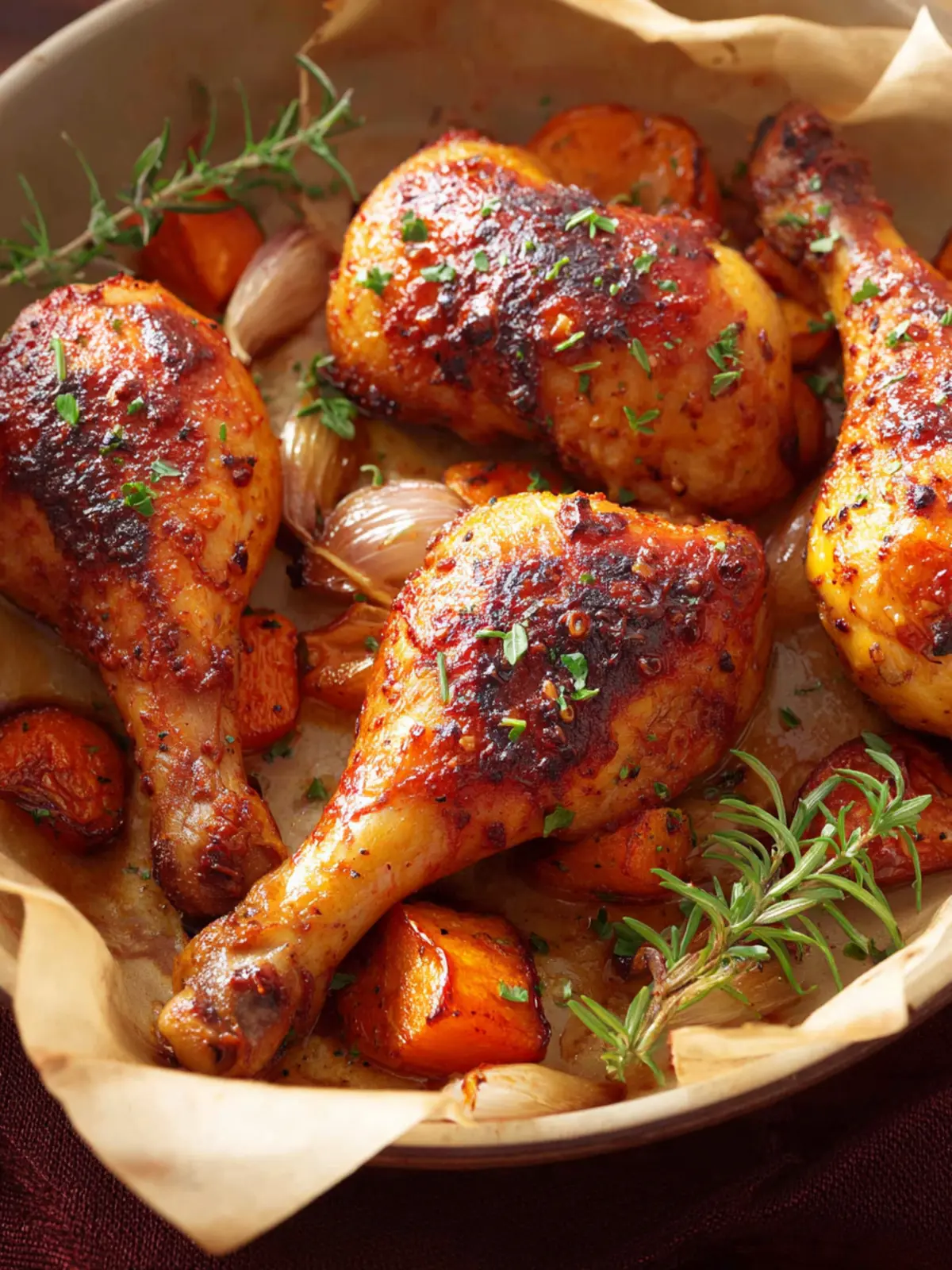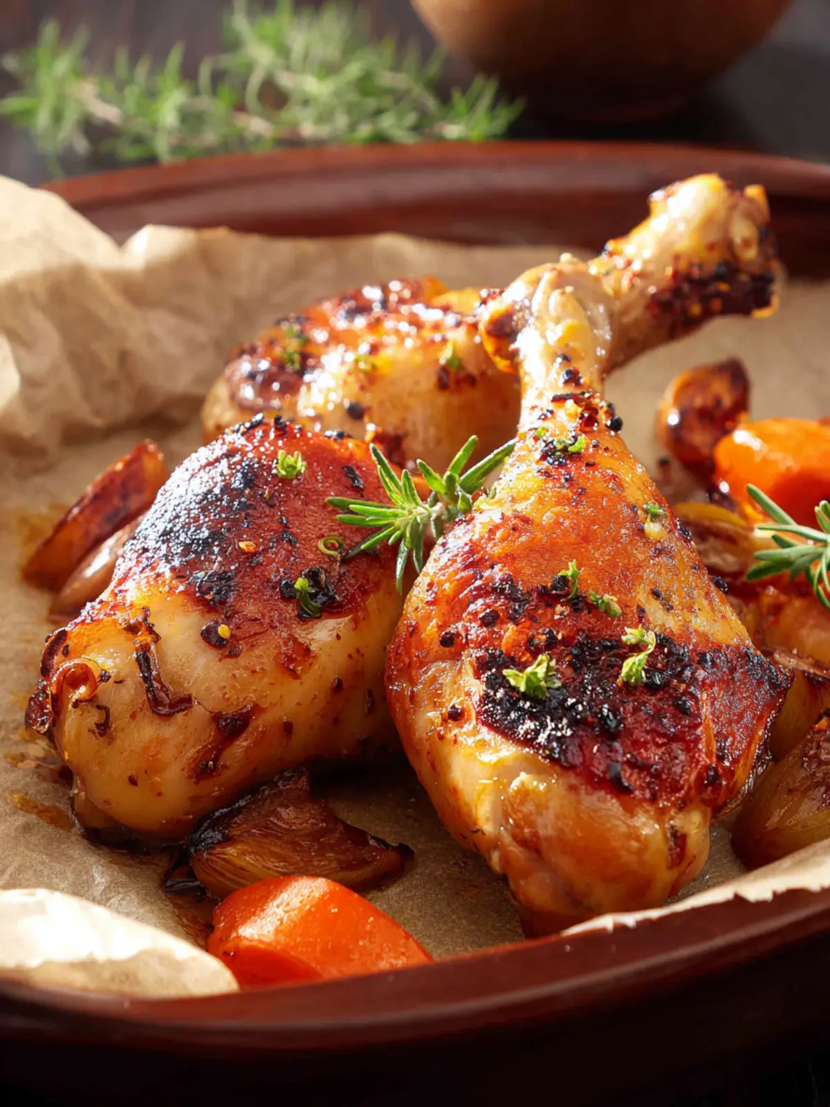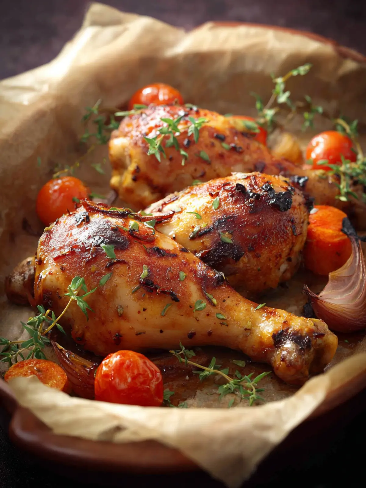 Delicious BBQ chicken legs baked with fresh vegetables.
