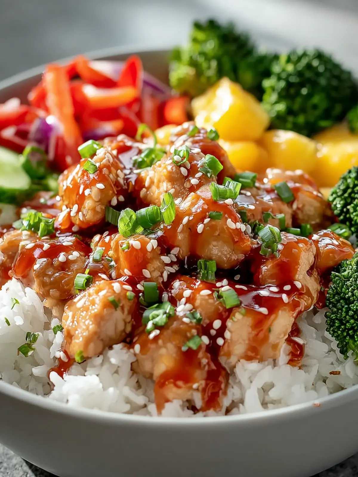 Fresh veggies like bell peppers, cucumber, and scallions add crunch and brightness to the bowl. They’re not just for show; these ingredients provide important nutrients while complementing the chicken and sauce beautifully.