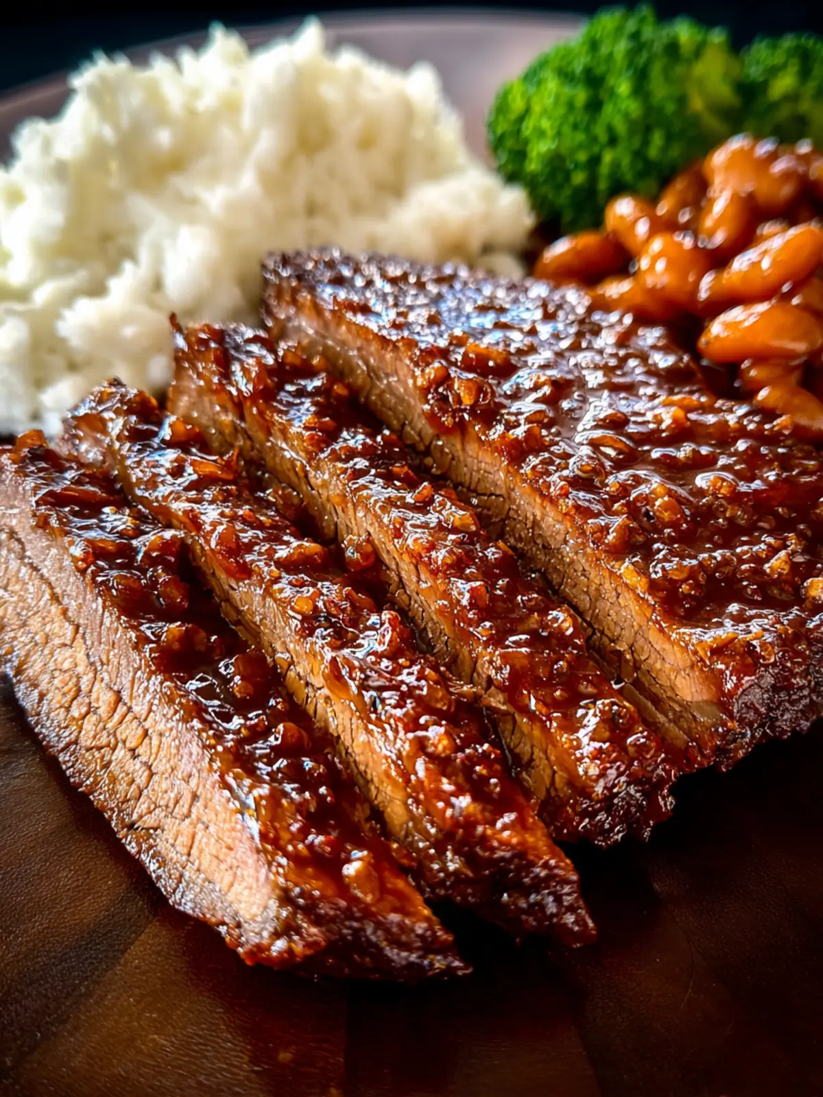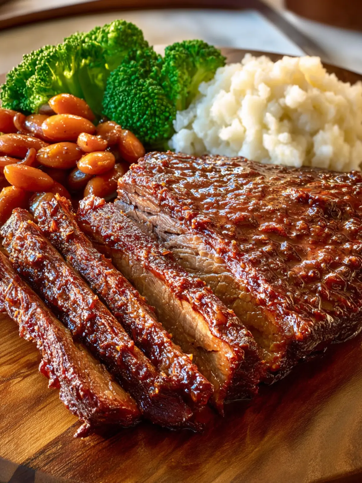 Indulge in this perfectly tender and flavorful slow cooked brisket, seasoned with spices and served with an optional BBQ glaze.