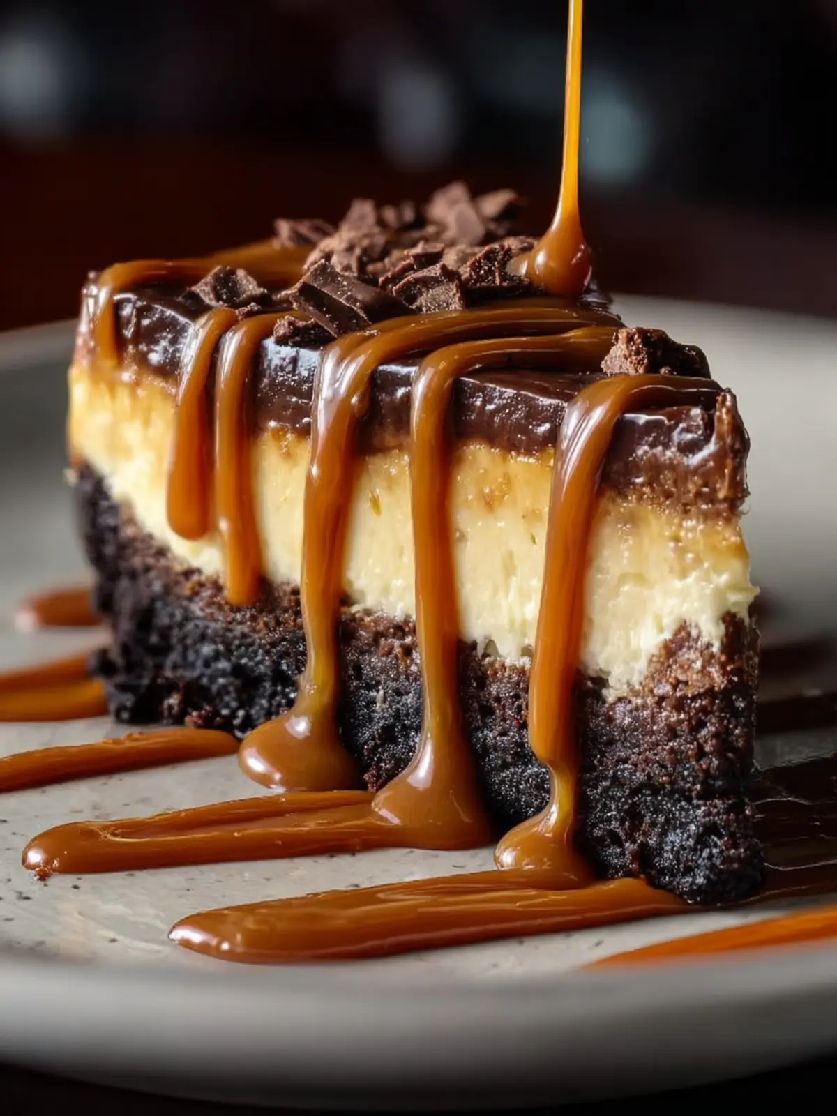 Textures that Please: The contrast of the dense brownie base and the light, creamy cheesecake filling offers a delightful texture play. Add the smooth caramel drizzle on top, and you have a dessert that invites you to savor each forkful.
