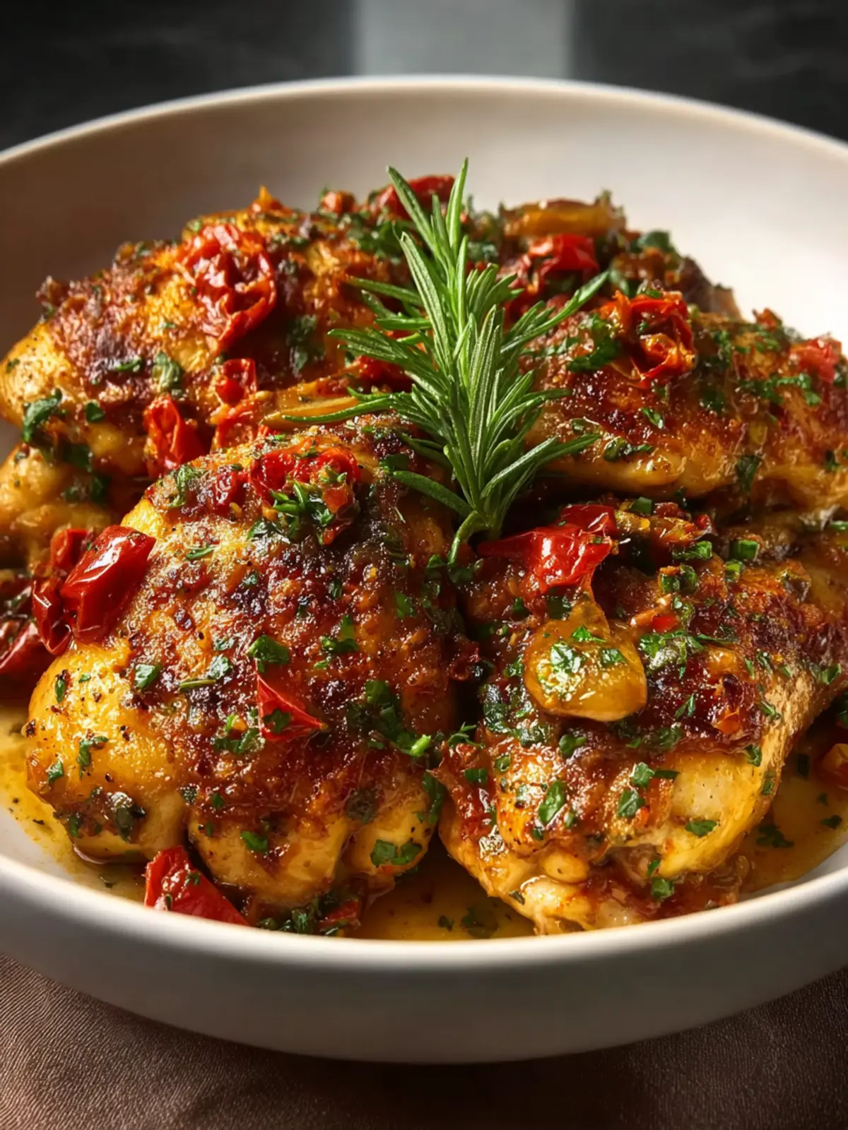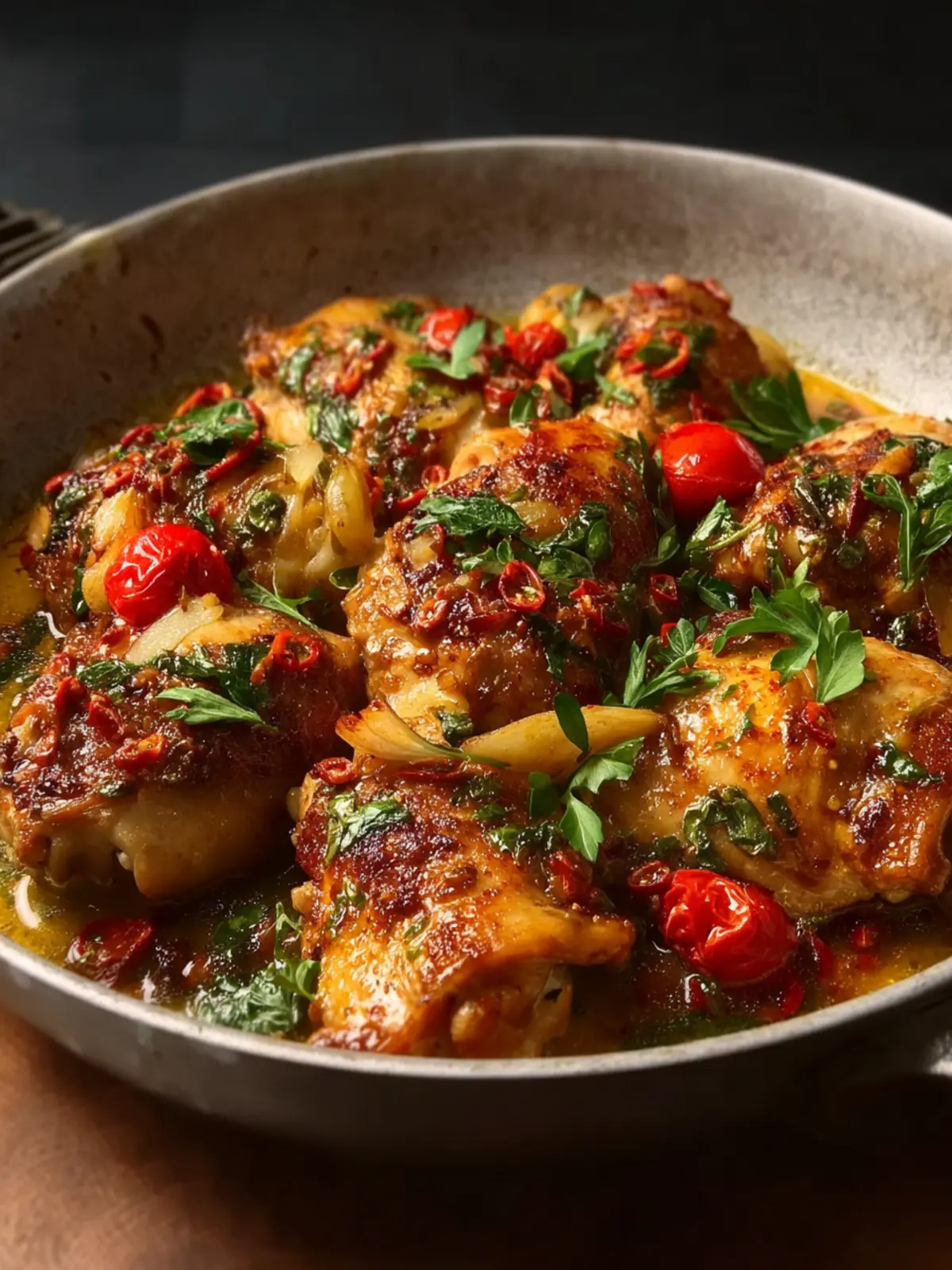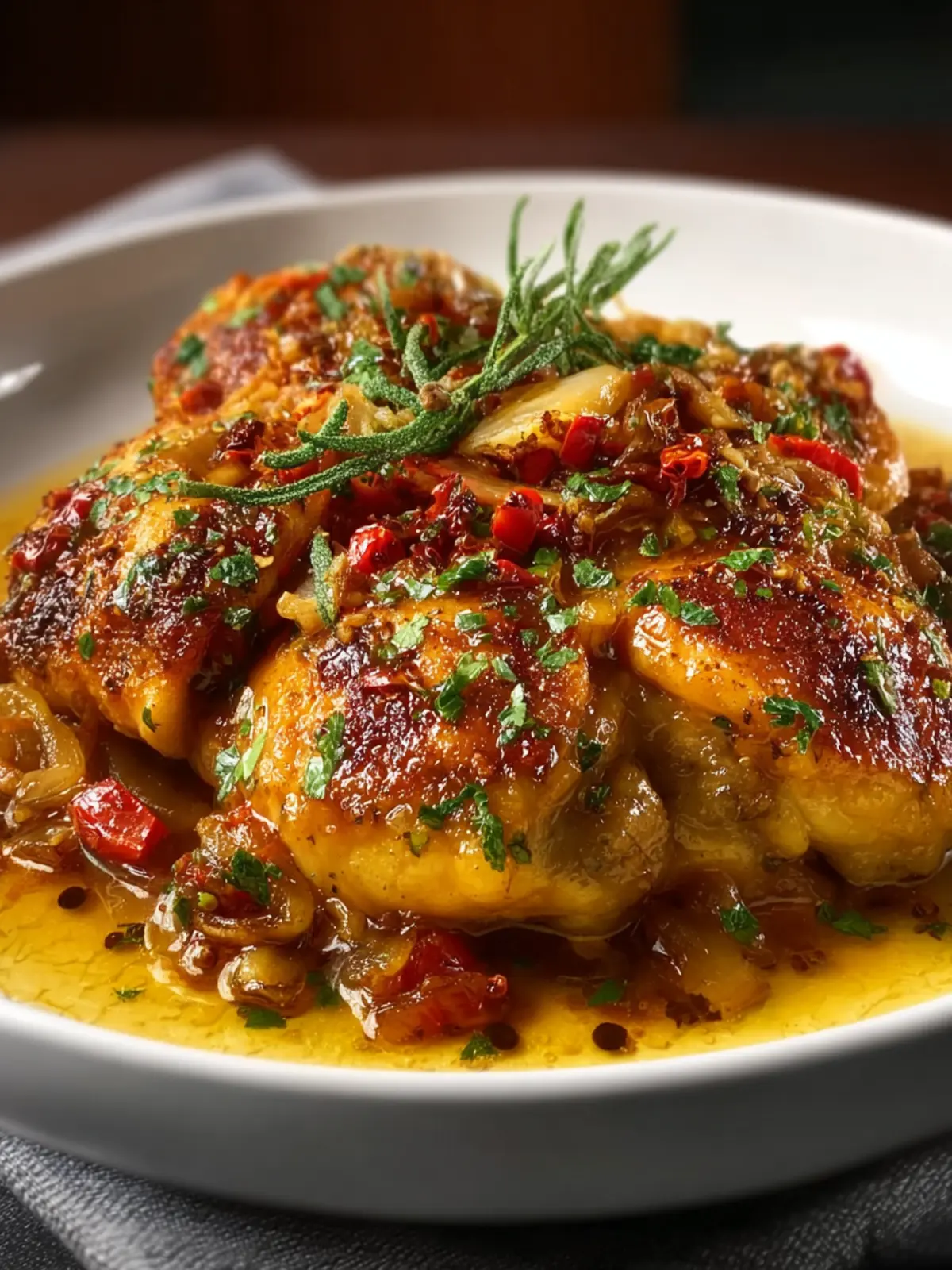 Flavor Explosion: The chicken is seared to a golden brown, allowing the Maillard reaction to work its magic, forming a rich base. Combined with the caramelized peppers, garlic, and olives, each bite bursts with layered flavors.