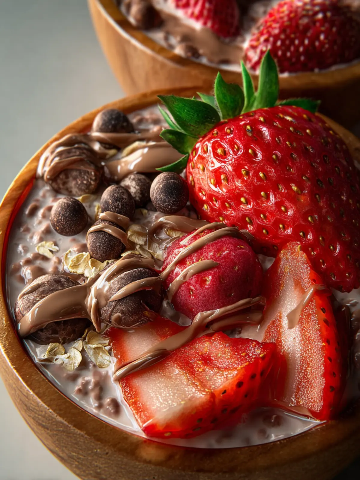A delicious and healthy chocolate chia oatmeal topped with fresh strawberries, perfect for a quick breakfast or snack.