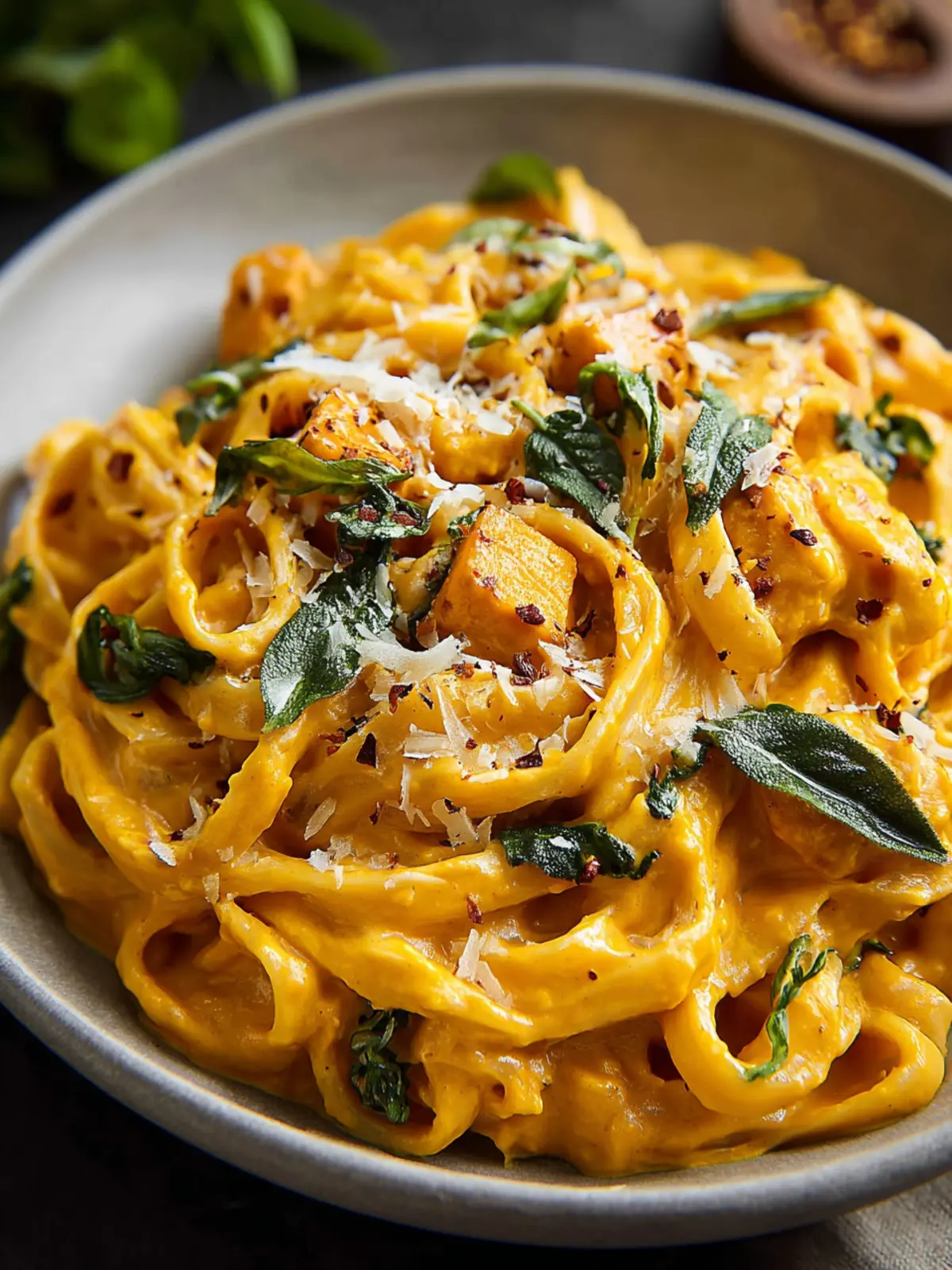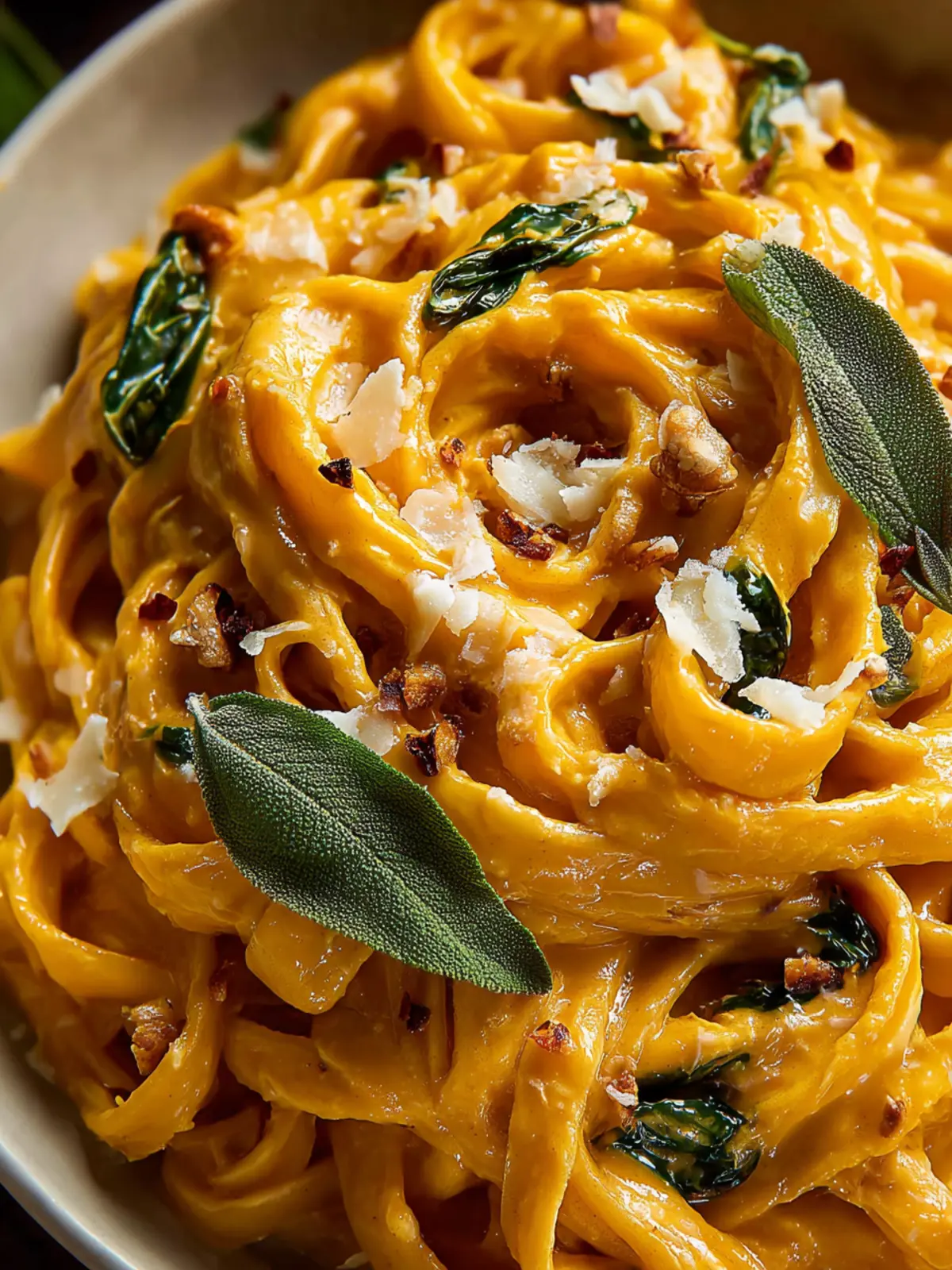 A rich and creamy pumpkin fettuccine pasta dish that’s perfect for fall.