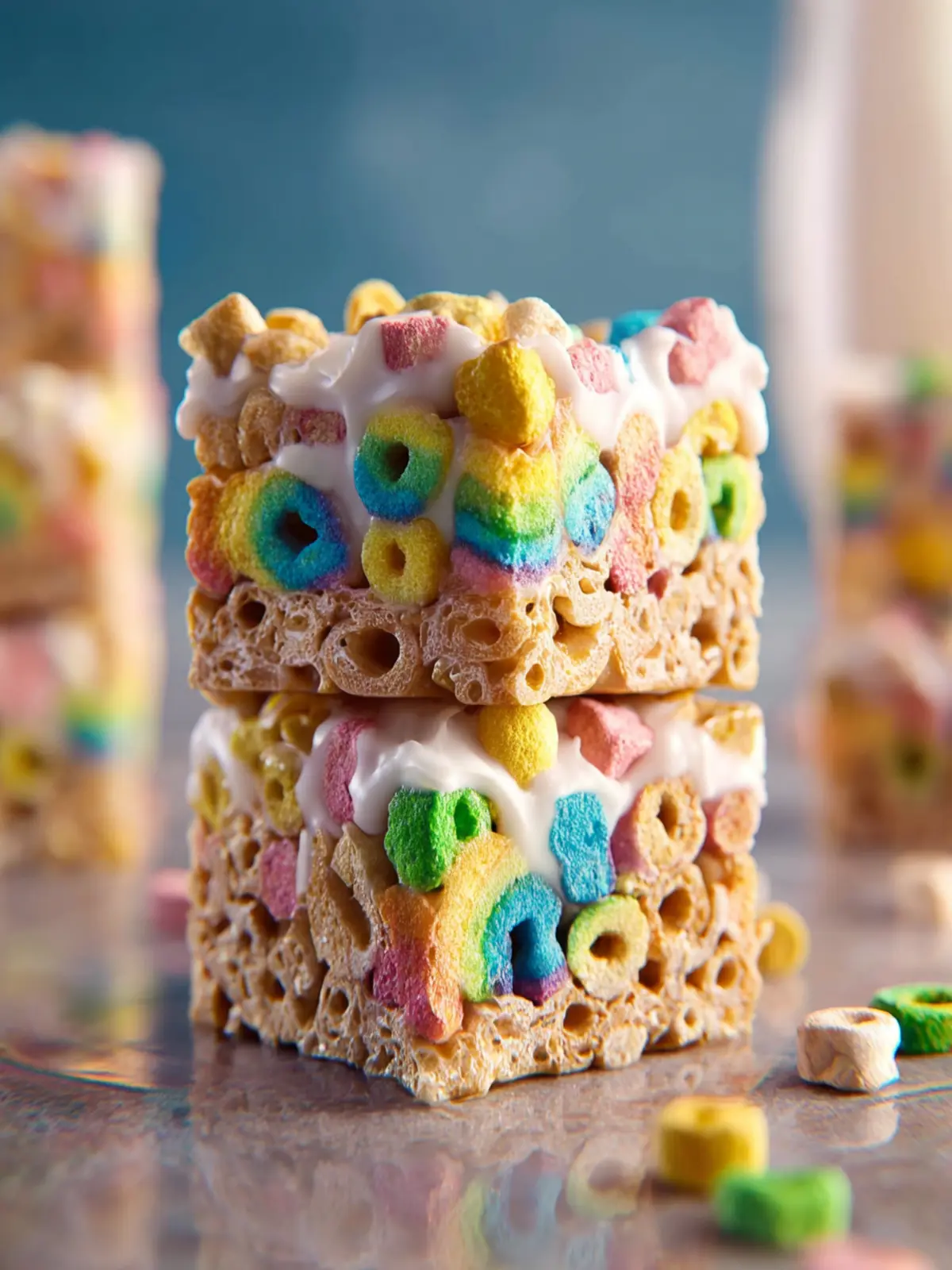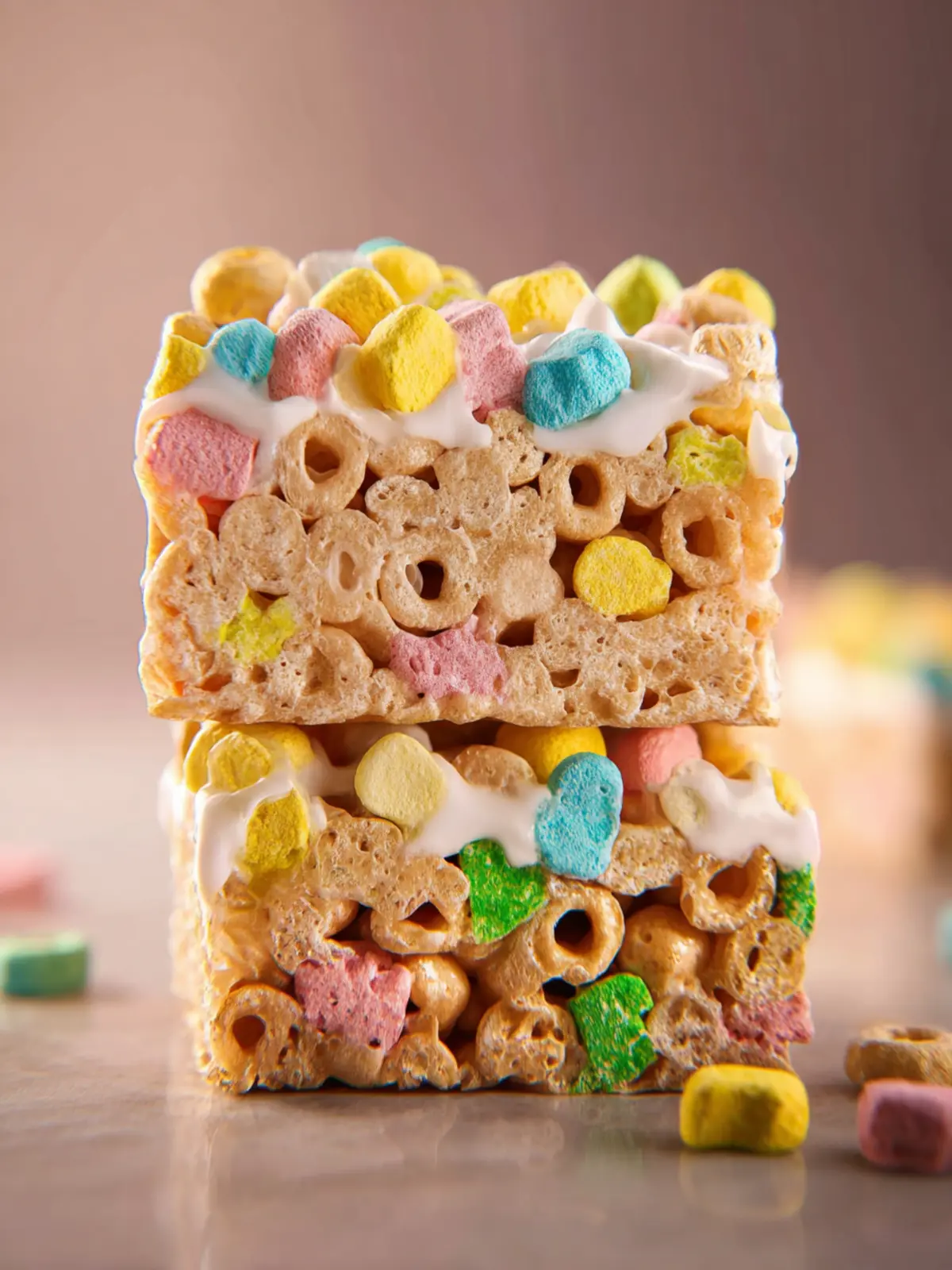 A delightful twist on classic rice crispy treats using Lucky Charms cereal.
