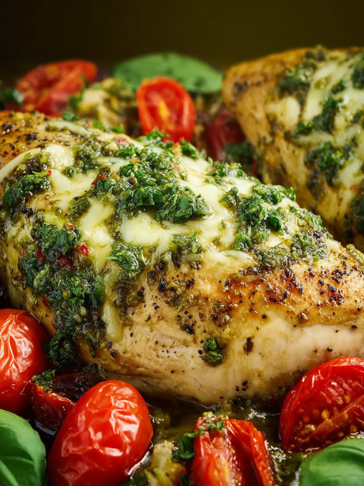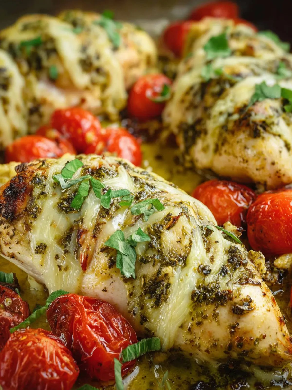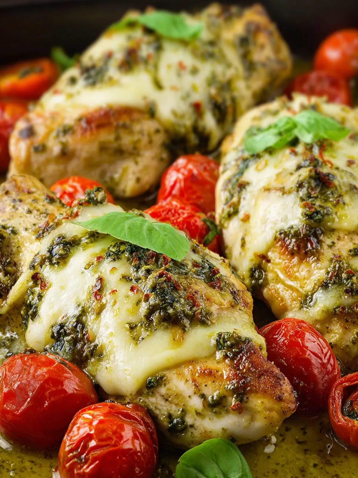 Deliciously baked chicken breasts coated in pesto, topped with mozzarella and Parmesan, and served with fresh cherry tomatoes and basil.