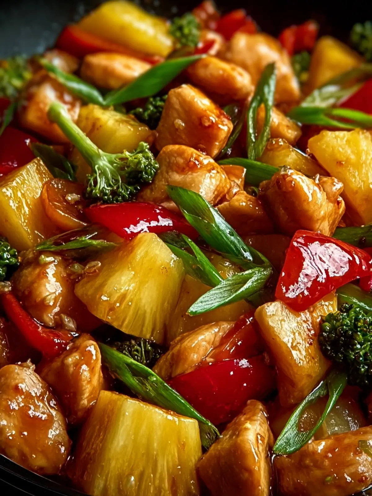 A delicious chicken stir-fry with colorful veggies and sweet pineapple, perfect for a quick meal!