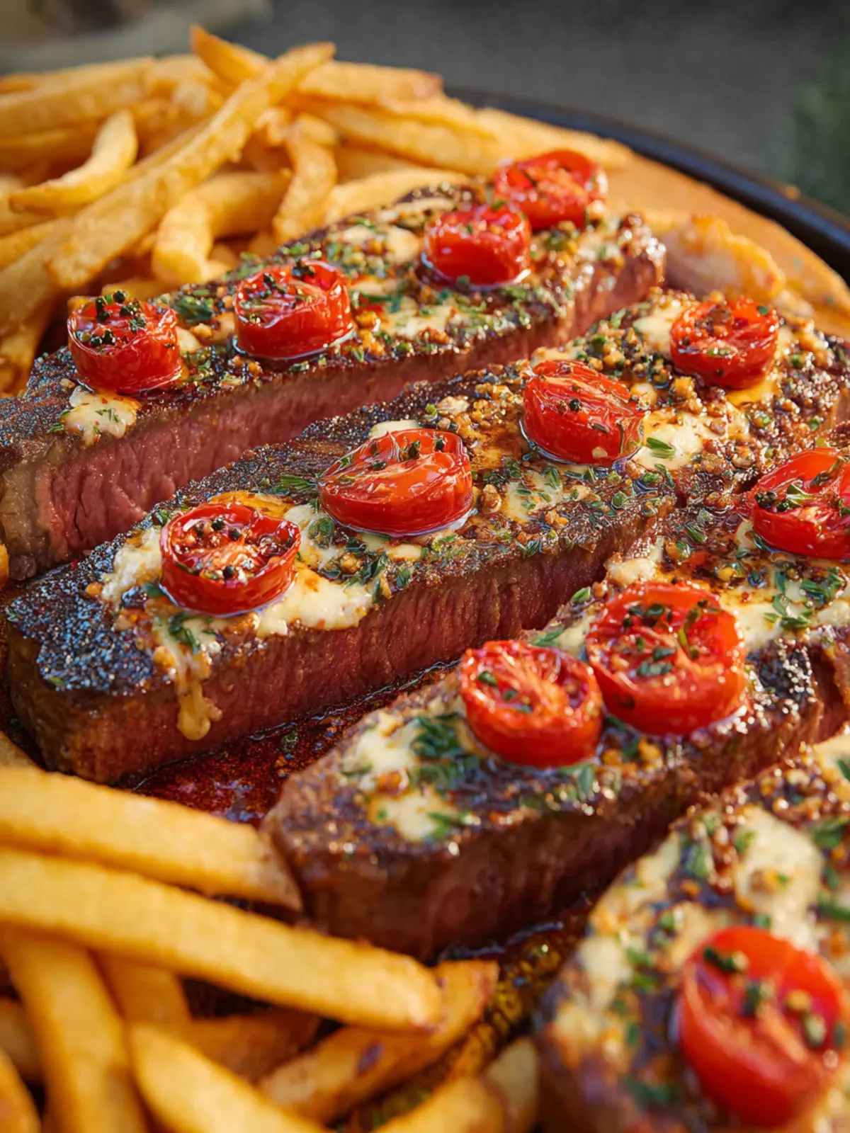 A delicious combination of perfectly grilled steaks topped with marinara, mozzarella, and pepperoni, served alongside crispy garlic butter fries.